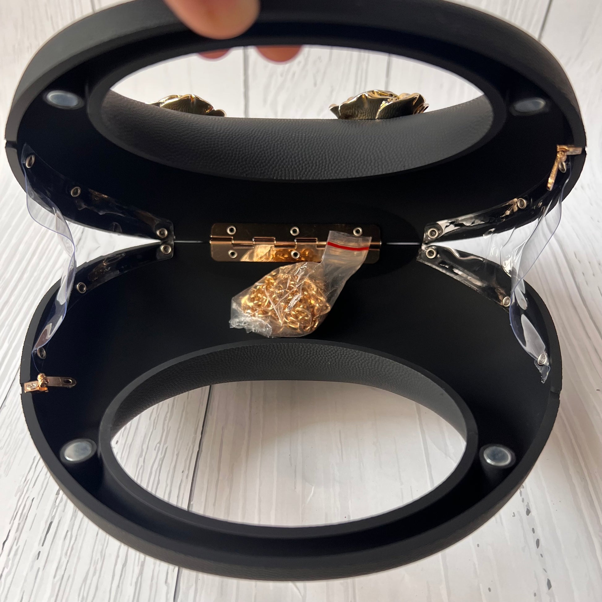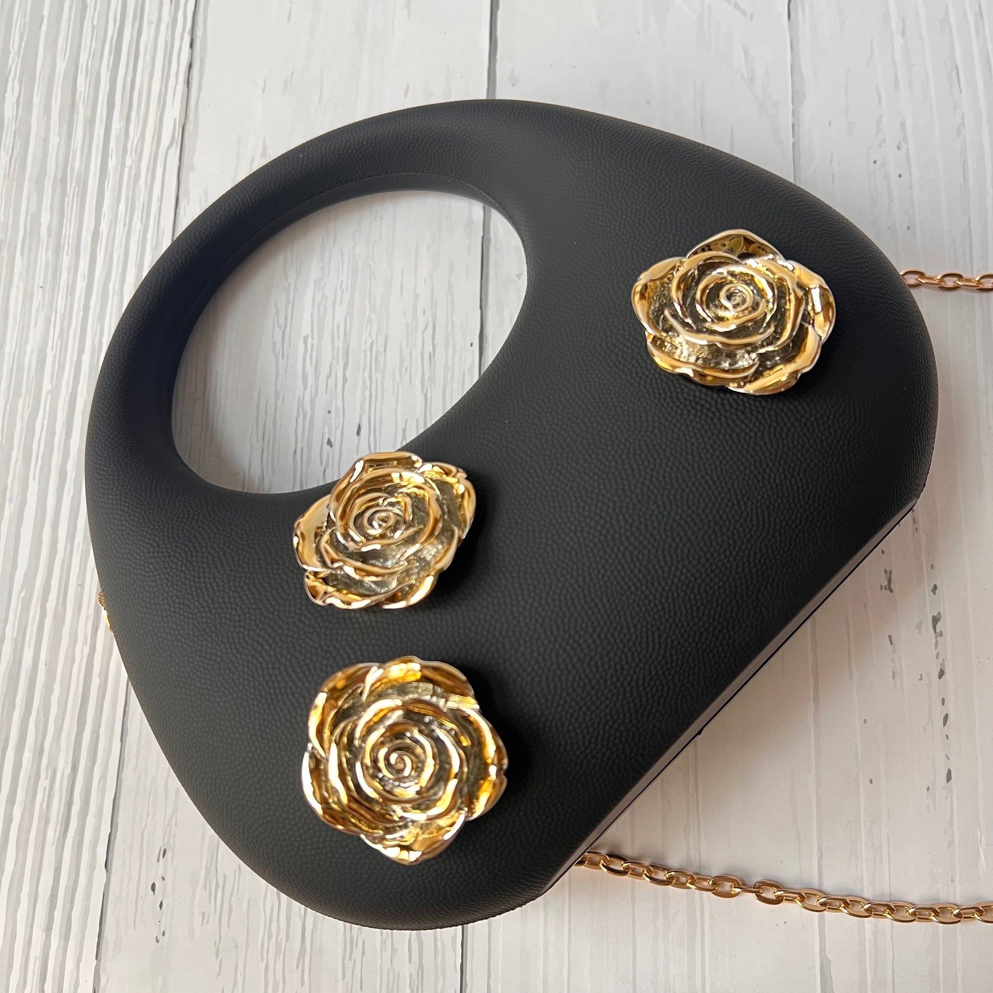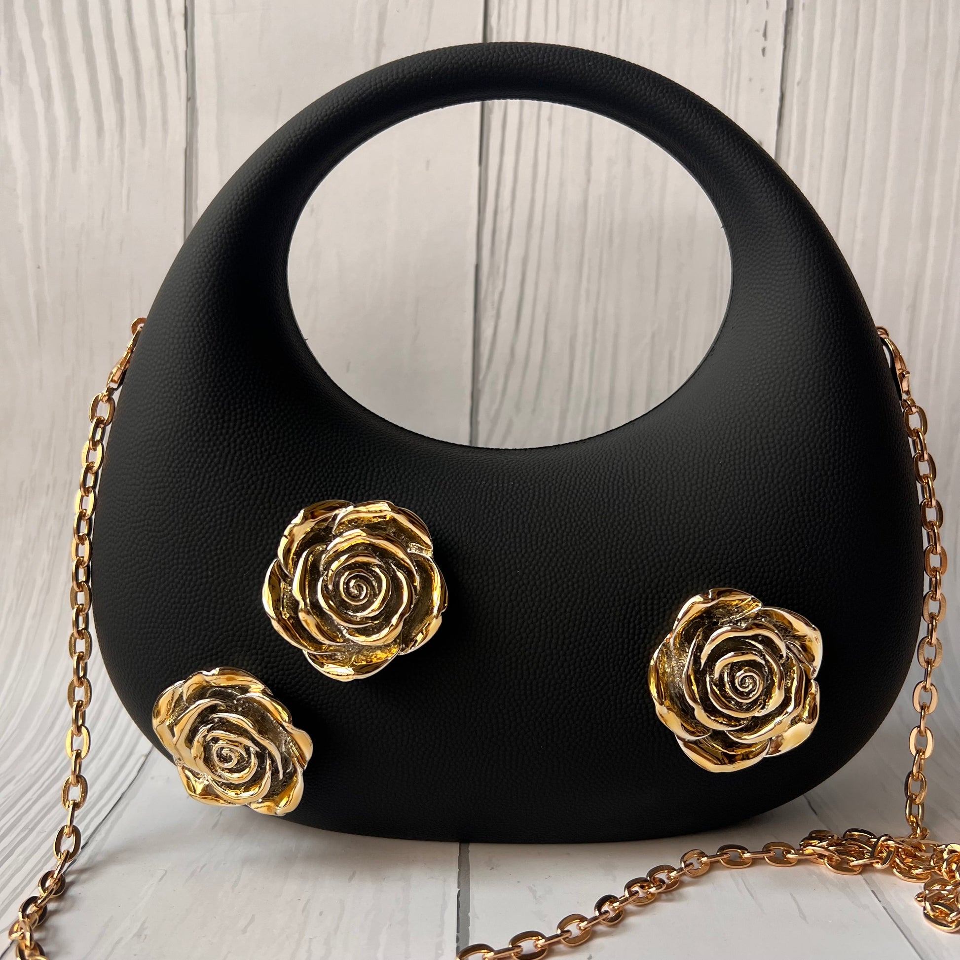 • Stylish handbag with a speckled design and golden rose accents