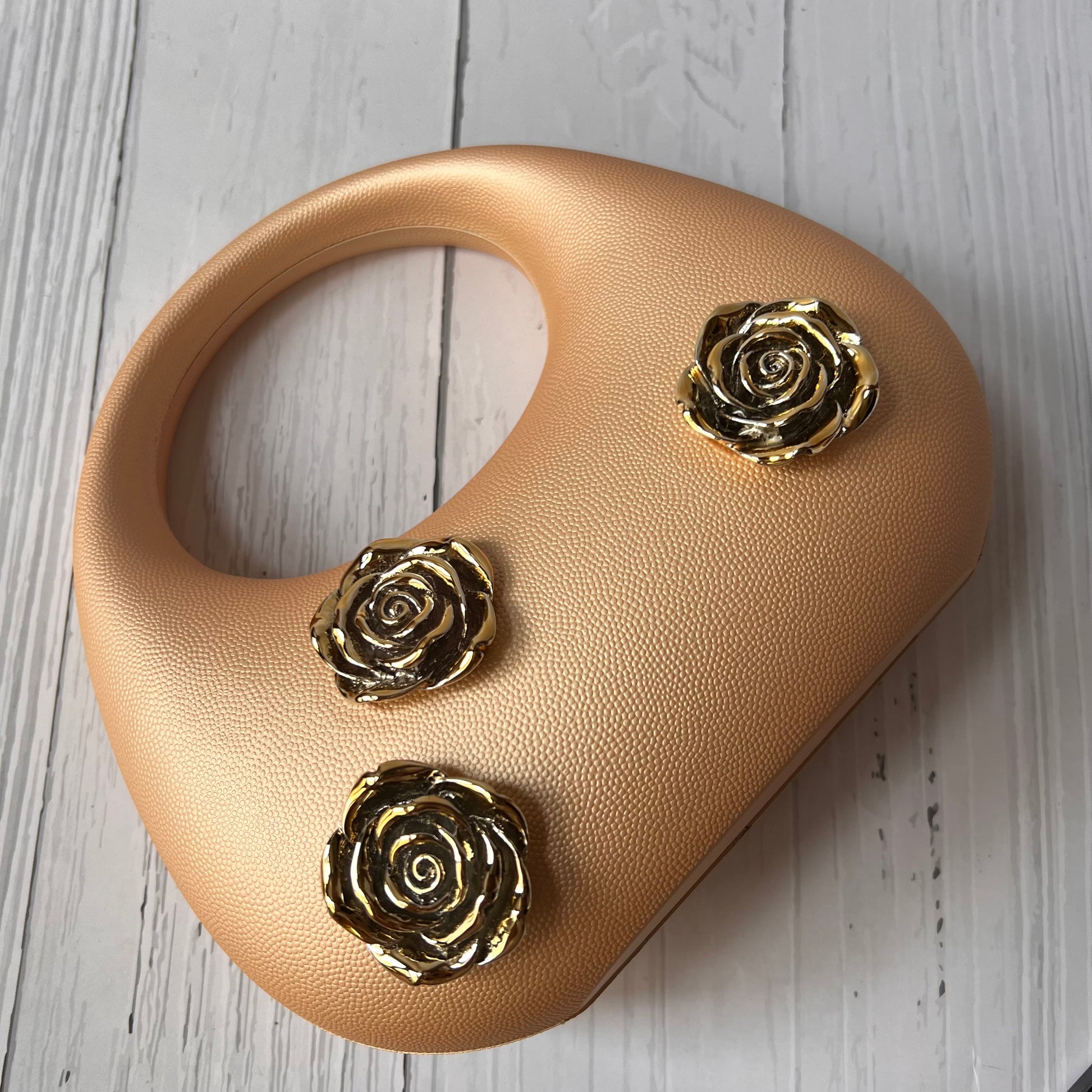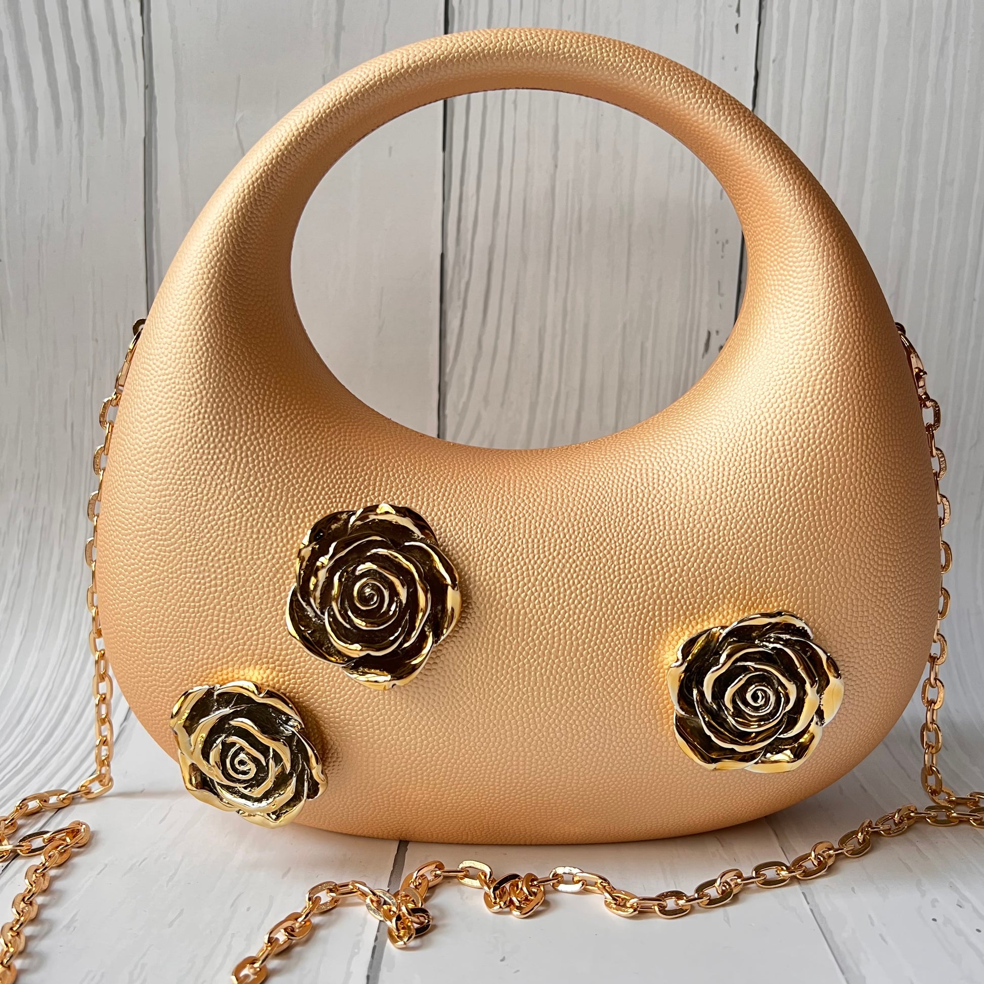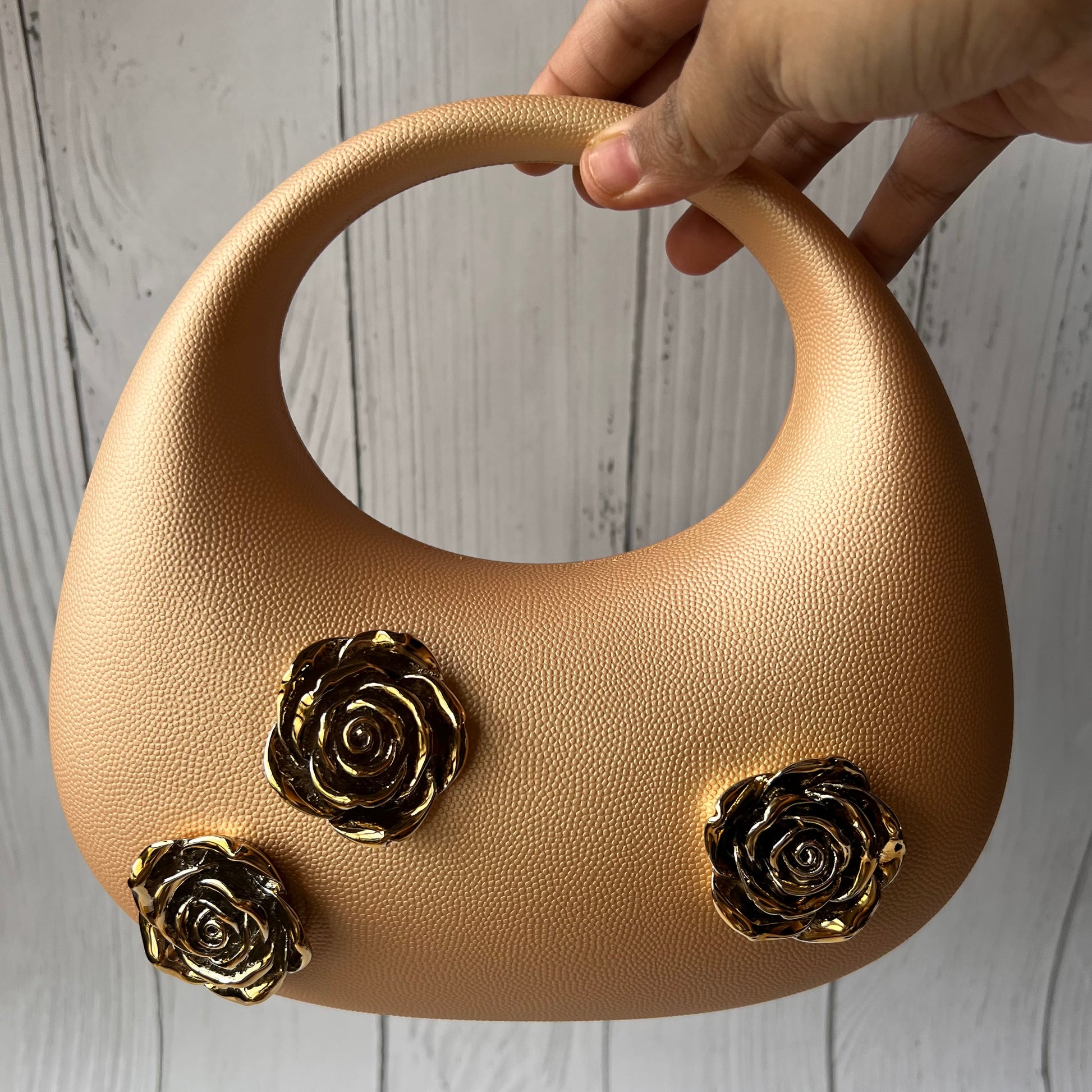 • Stylish handbag with a speckled design and golden rose accents
