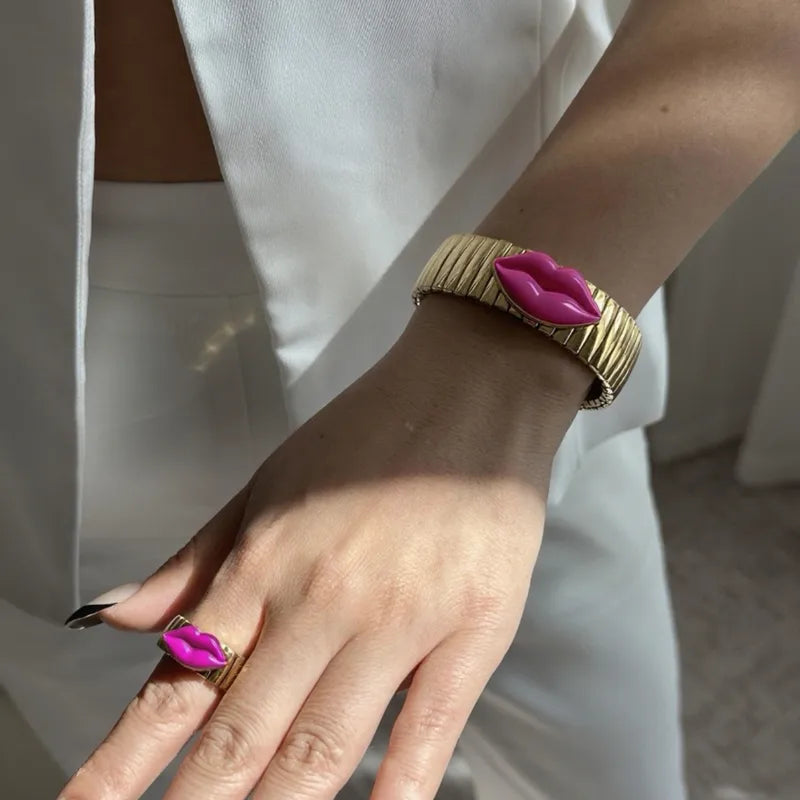 Add a bold, playful touch to your style with this striking gold-tone ring and bracelet featuring vibrant pink lip motifs. Available individually or as a matching set.